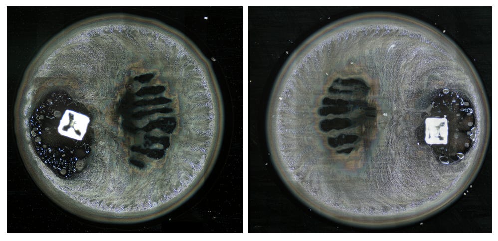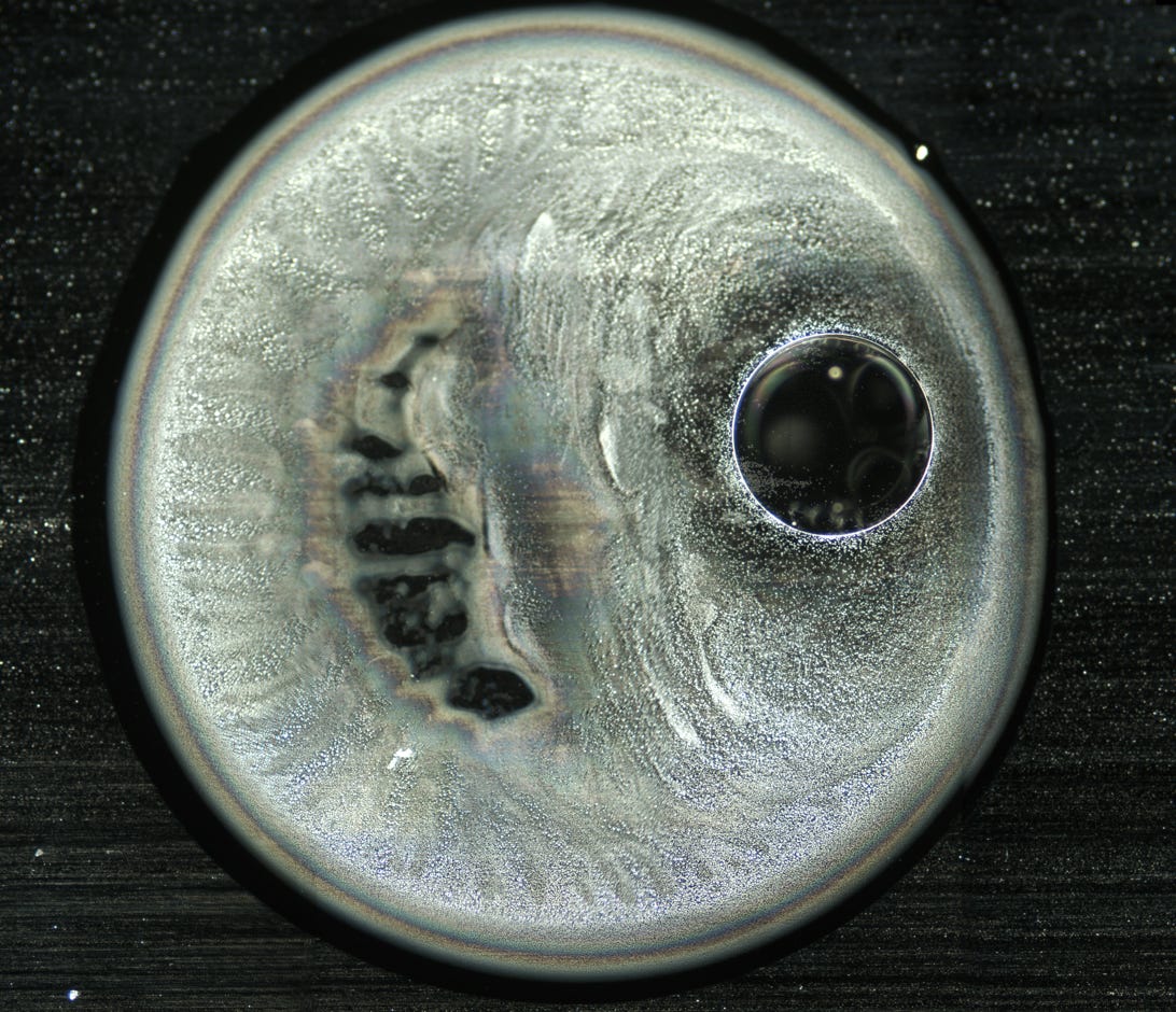 Orgonite-treated samples showed delayed or even arrested crystallisation. Instead of organised forms, I observed Coherence Residual Domains (CRDs) — static, circular regions where the assembly process stalled.